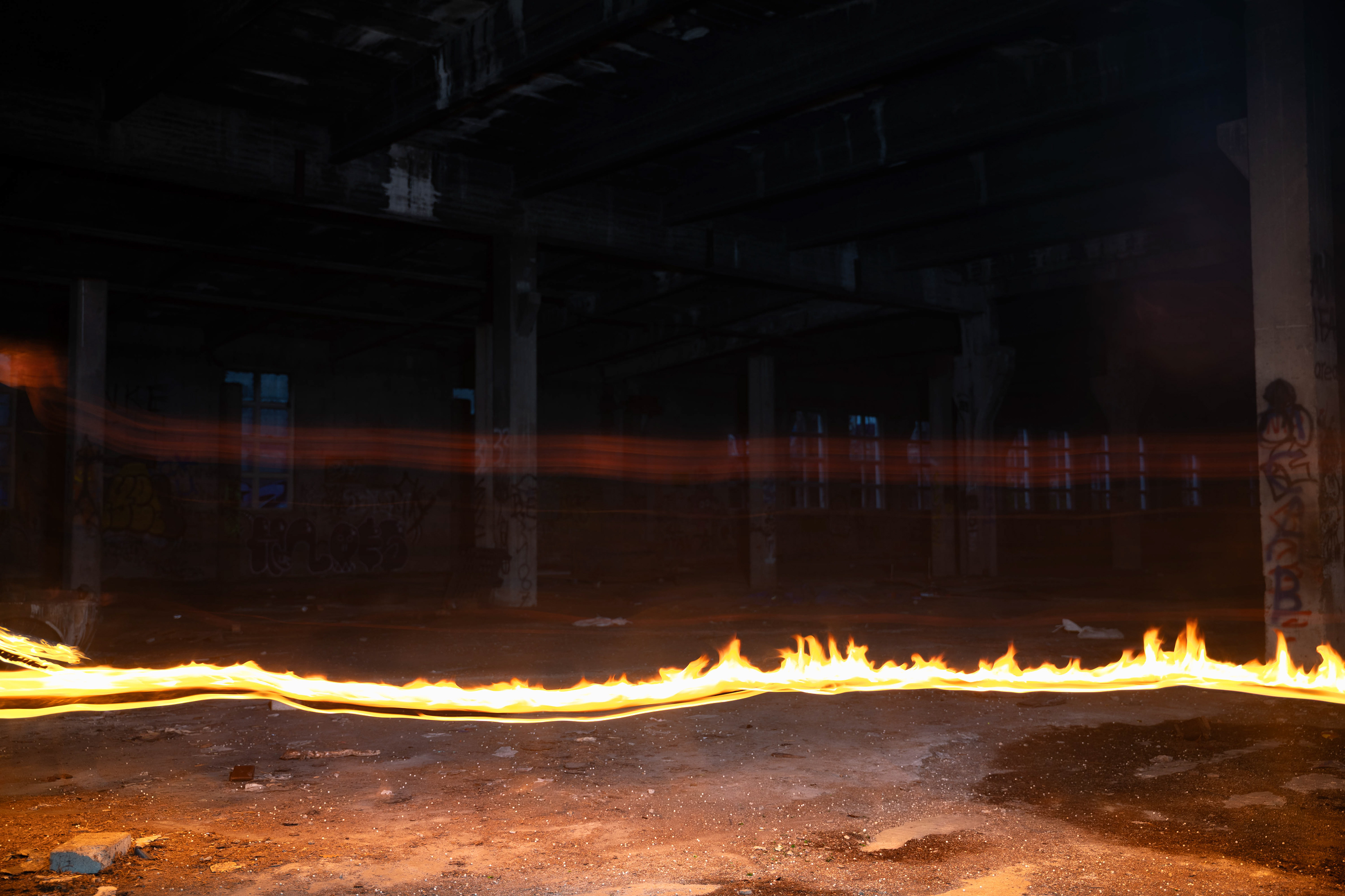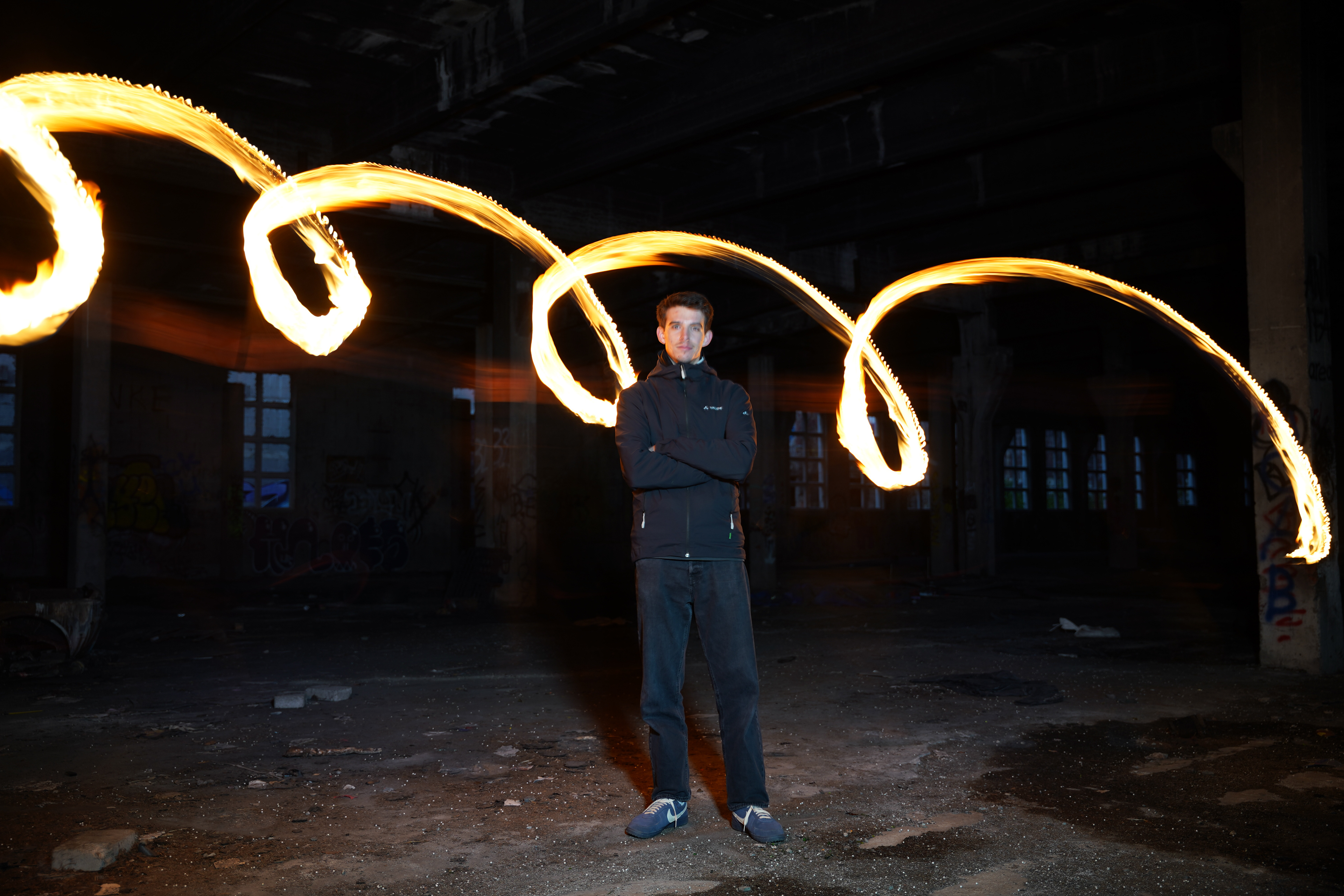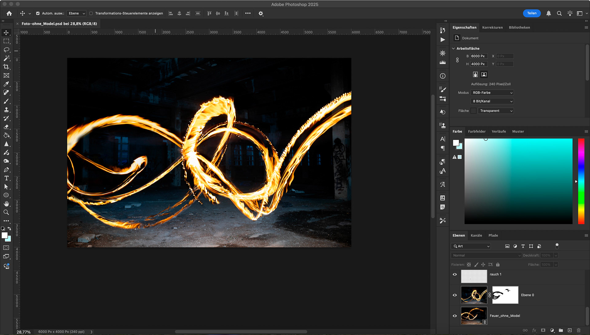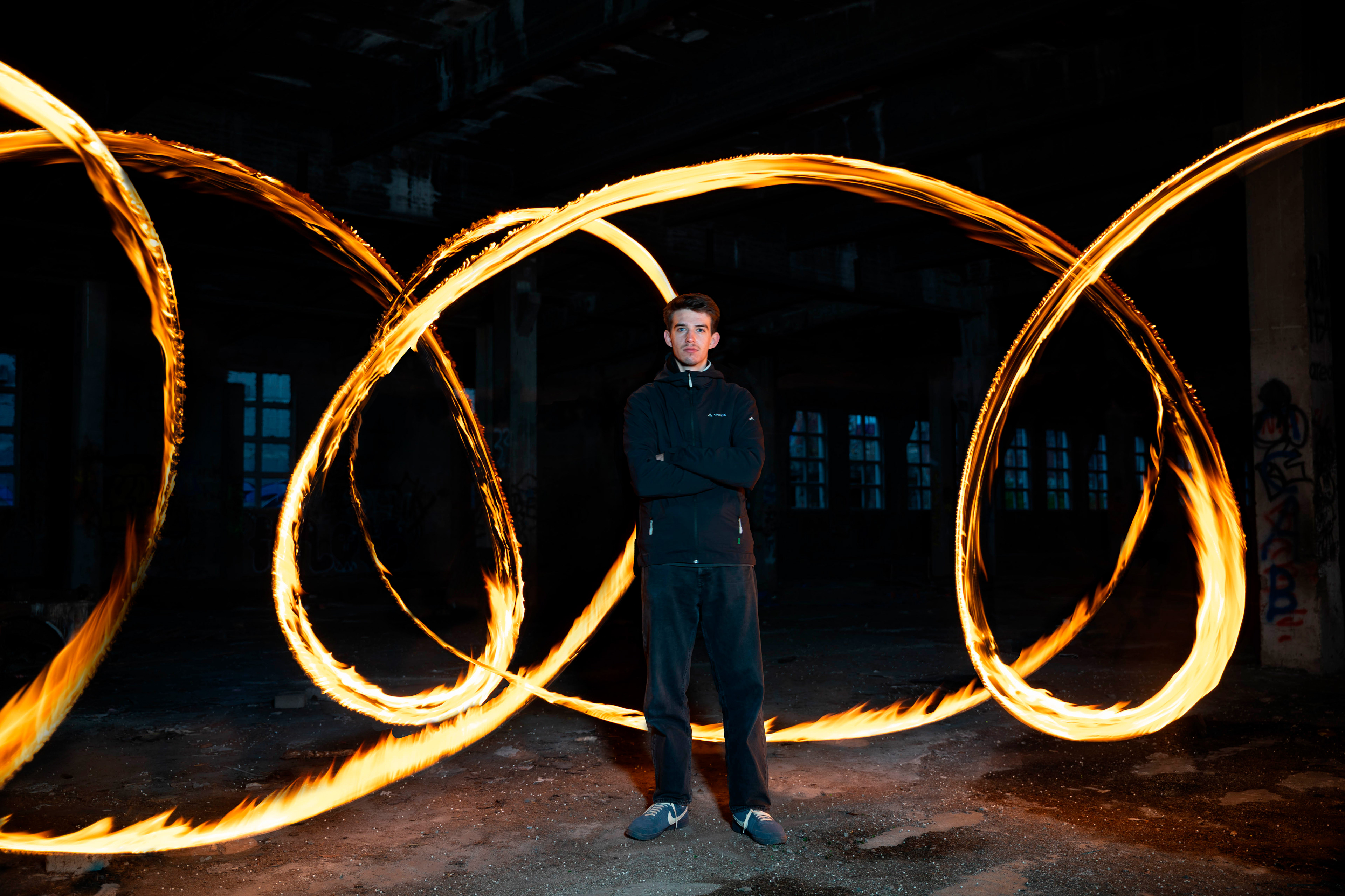 Für die Nachbearbeitung nutzten wir Photoshop. Dabei entfernten wir einige störende Flecken und optimierten die Bildwirkung, indem wir die Flammen aufgehellt, den Boden wärmer getönt und die Fenster heller gestaltet haben. Außerdem setzten wir das finale Bild aus mehreren Aufnahmen zusammen, um eine intensivere und eindrucksvollere Wirkung zu erzielen.