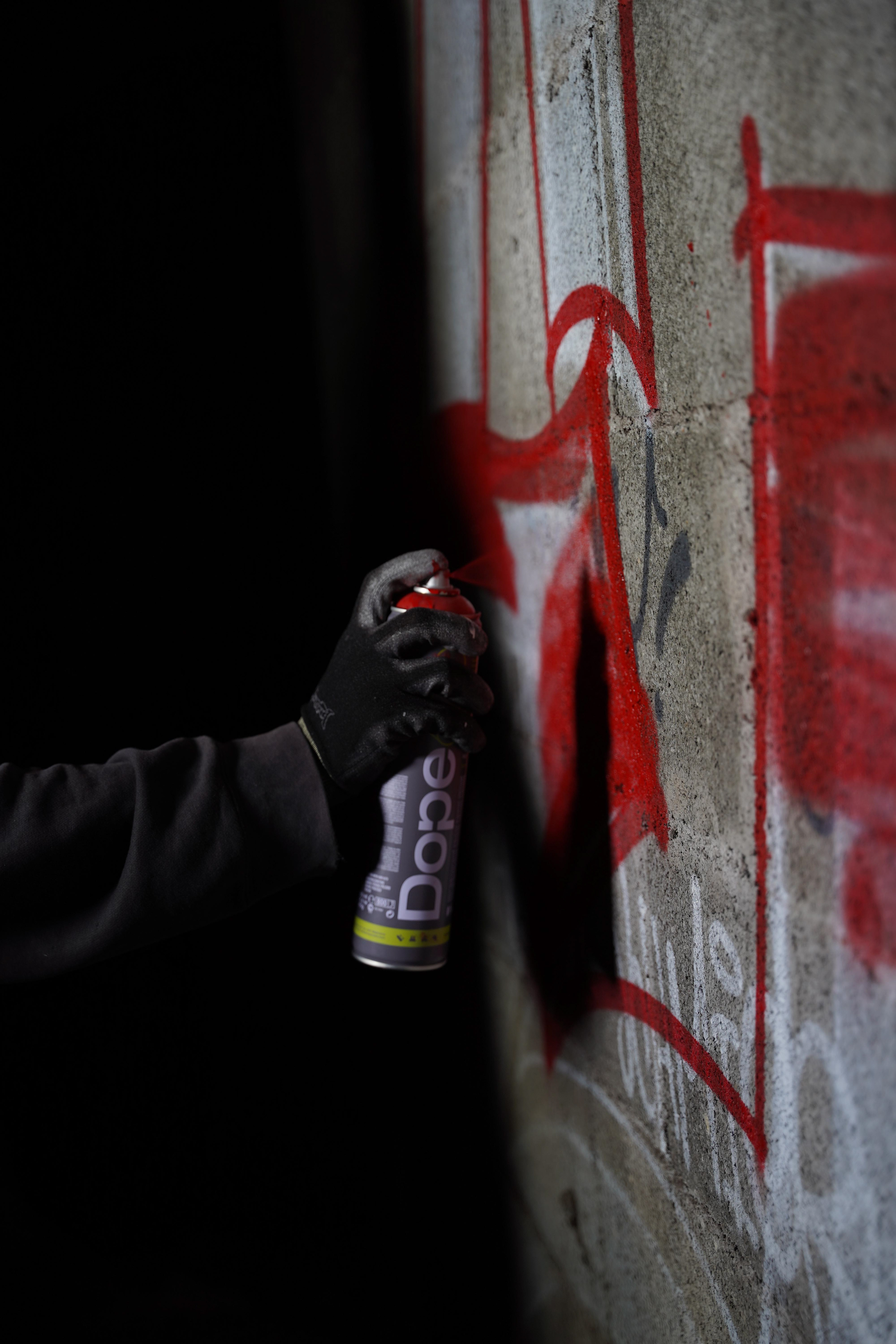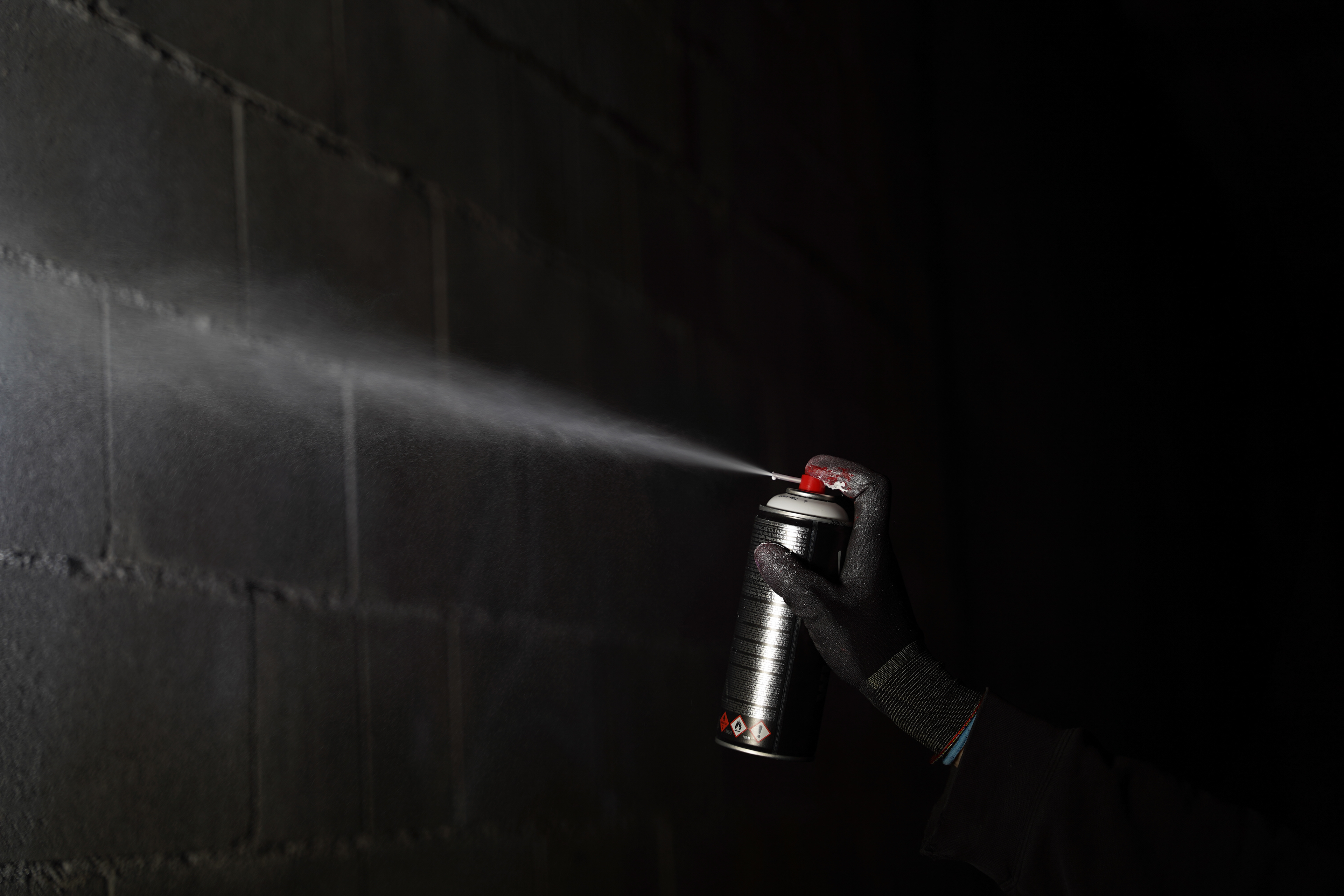 Eine weitere Idee von uns war es, mit Kurzzeitbelichtung zu arbeiten und dabei Spraydosen einzusetzen. Ziel war es, die feinen Farbpartikel im Moment des Sprühens festzuhalten.