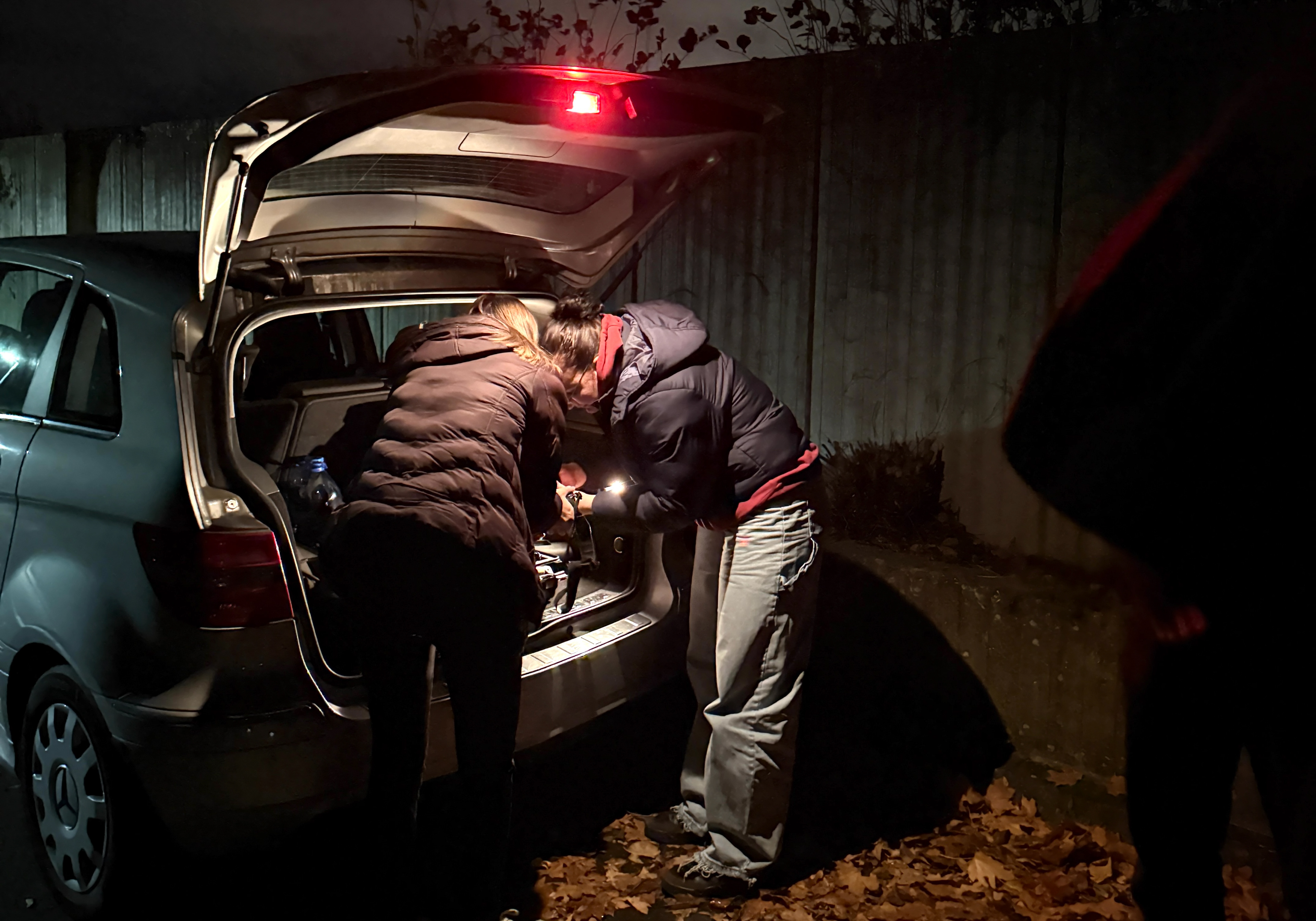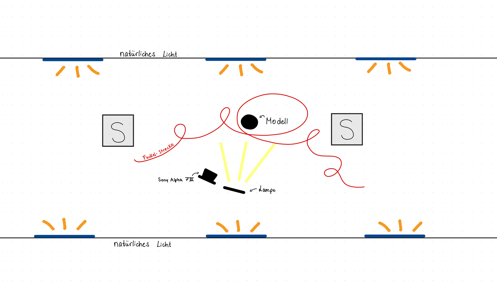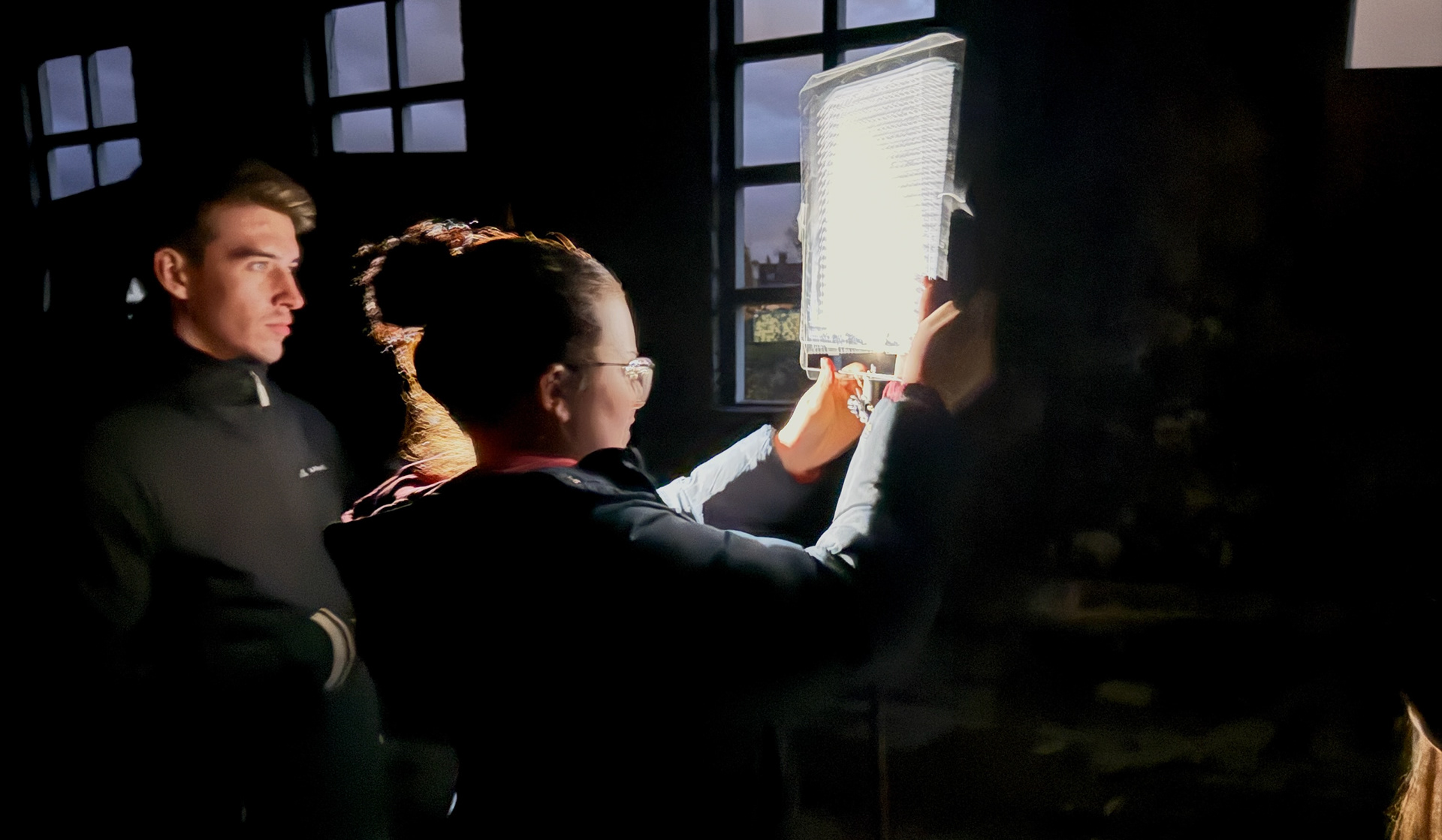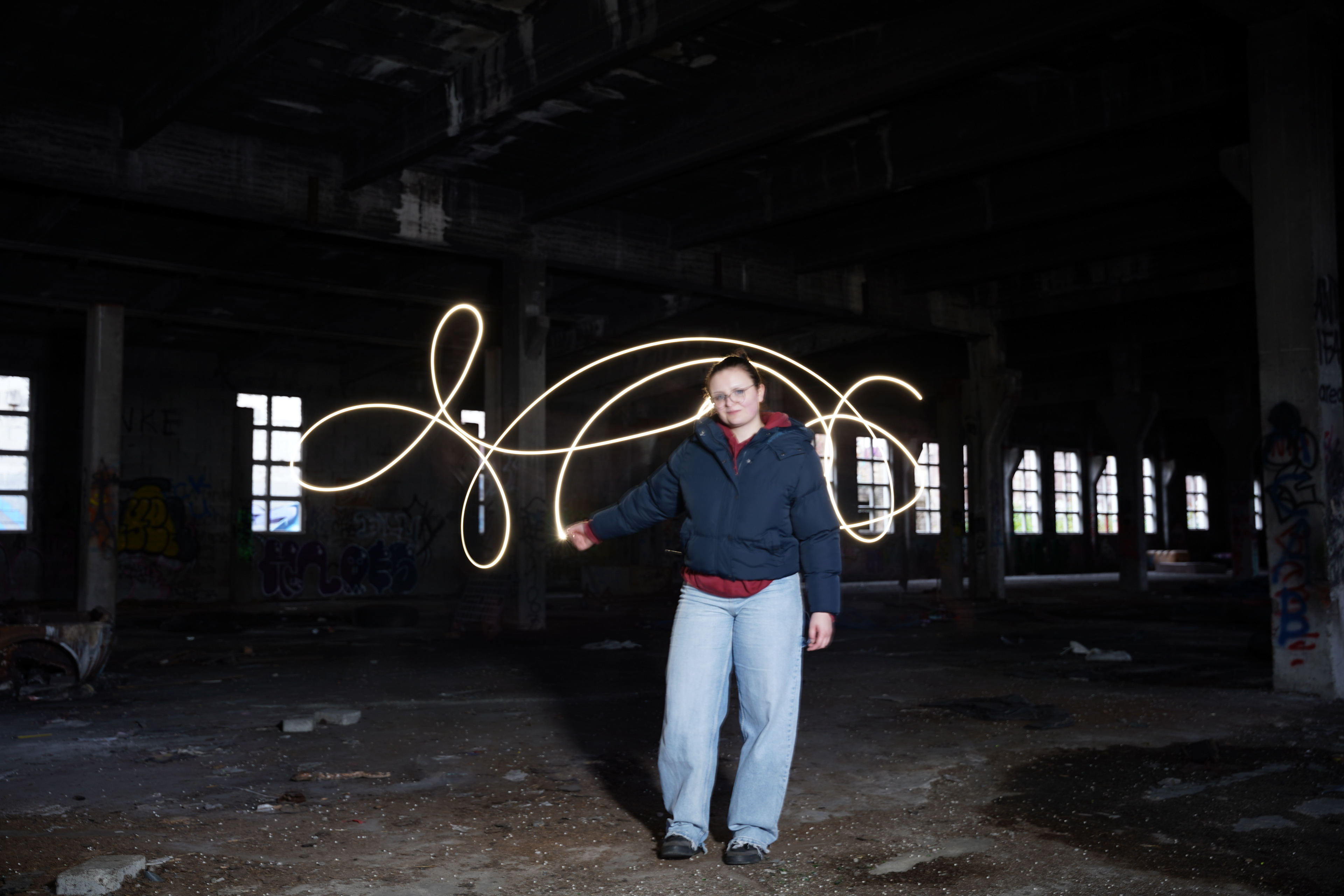 Hier haben wir mit Licht experimentiert und versucht, verschiedene Formen zu zeichnen – einerseits, um die Wirkung zu beobachten, andererseits als Vorbereitung für die späteren Aufnahmen mit den Fackeln.